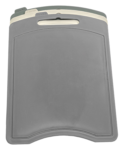 As tábuas em PP possuem cores diferentes (verde, bege e cinza), facilitando a organização e ajudando a evitar o uso da mesma superfície para diferentes alimentos.